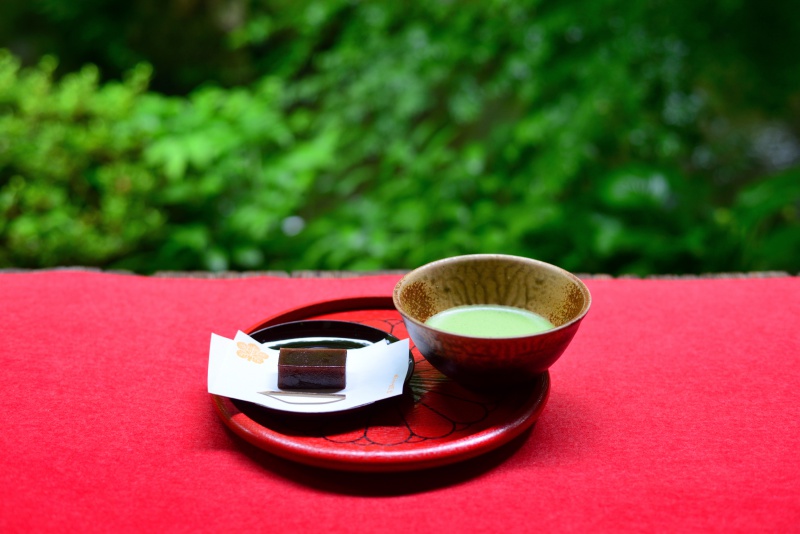 お茶代(600円)を納めて、特等席から庭園を満喫できます。目の前に拡がる美景はもちろん、鳥のさえずりや葉擦れの音、抹茶の豊かな香りに、きっと心も落ち着くことでしょう。