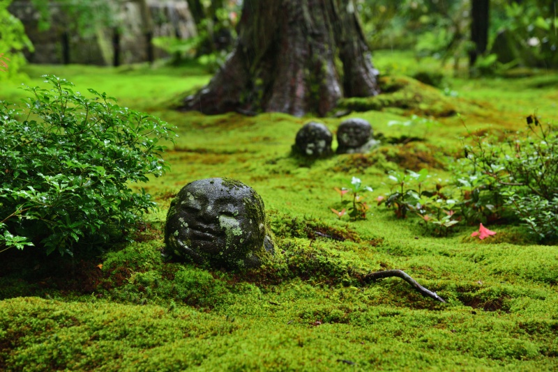 有清園の一角に、石彫刻家の杉村孝氏が手がけたわらべ地蔵が出迎えてくれます。苔と一体となった姿は、100年以上前からそこにあるかのよう。その優しく微笑む姿に、つい笑顔がこぼれてしまいます。