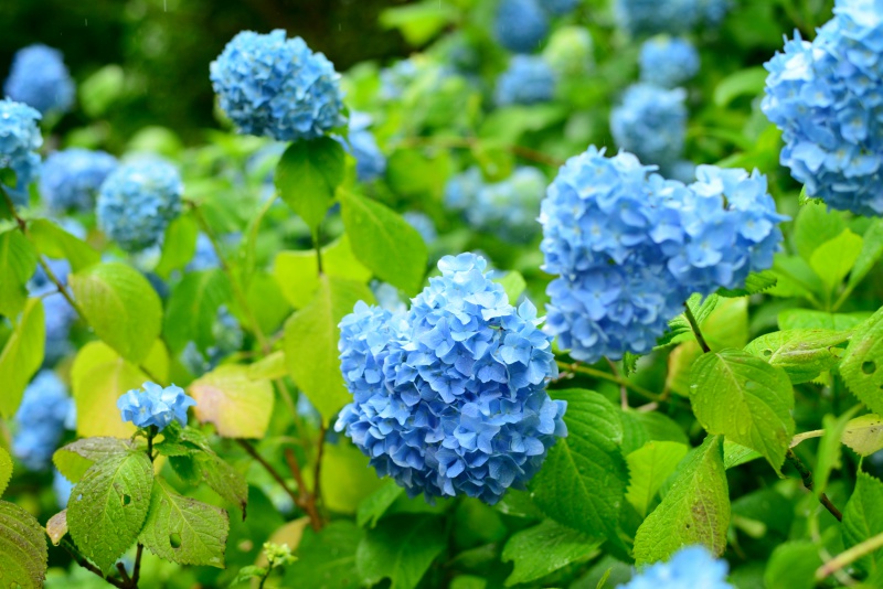 三千院の初夏を彩るのが、有清園の先にあるあじさい苑のアジサイ。例年6月中旬から7月中旬にかけて見頃を迎え、ホソアジサイやヤマアジサイなど、約1000株以上が華やかに咲き誇ります。