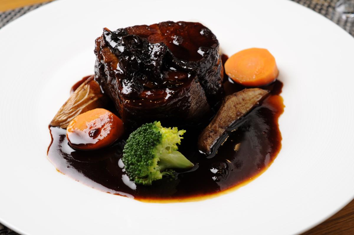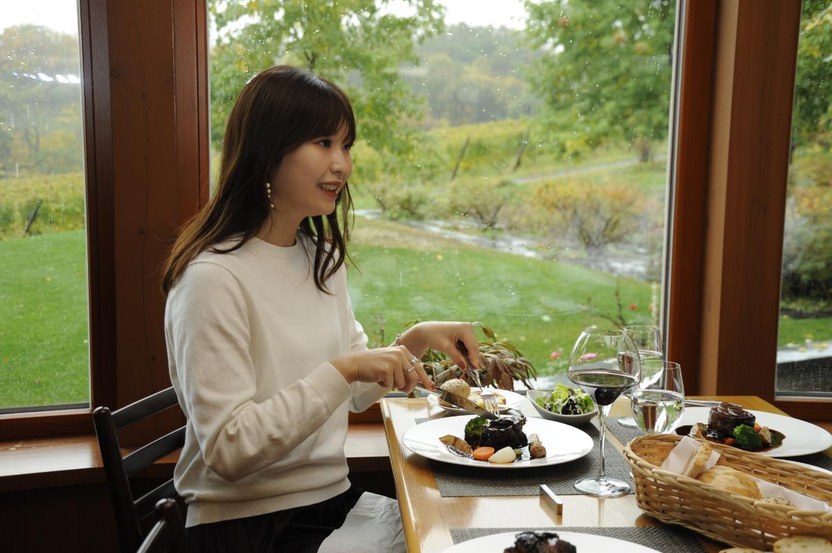 レストランは、自社のブドウ畑の向こうに、札幌や小樽の山々も遠望できる眺めのいい立地。ほろりと軟らかくなるまで煮込んだ「余市麦豚のプルーンと赤ワイン煮」2200円や、「近海平目のブイヤベース」2640円、余市産「北島豚」ときのこのミートソースを合わせた「麦豚ときのこのボロネーズ」1870円など、ワインと合わせたくなる料理が揃います。ワインと一緒に軽くつまみたいというときは、「前菜盛り合わせ」1760円もおすすめ。