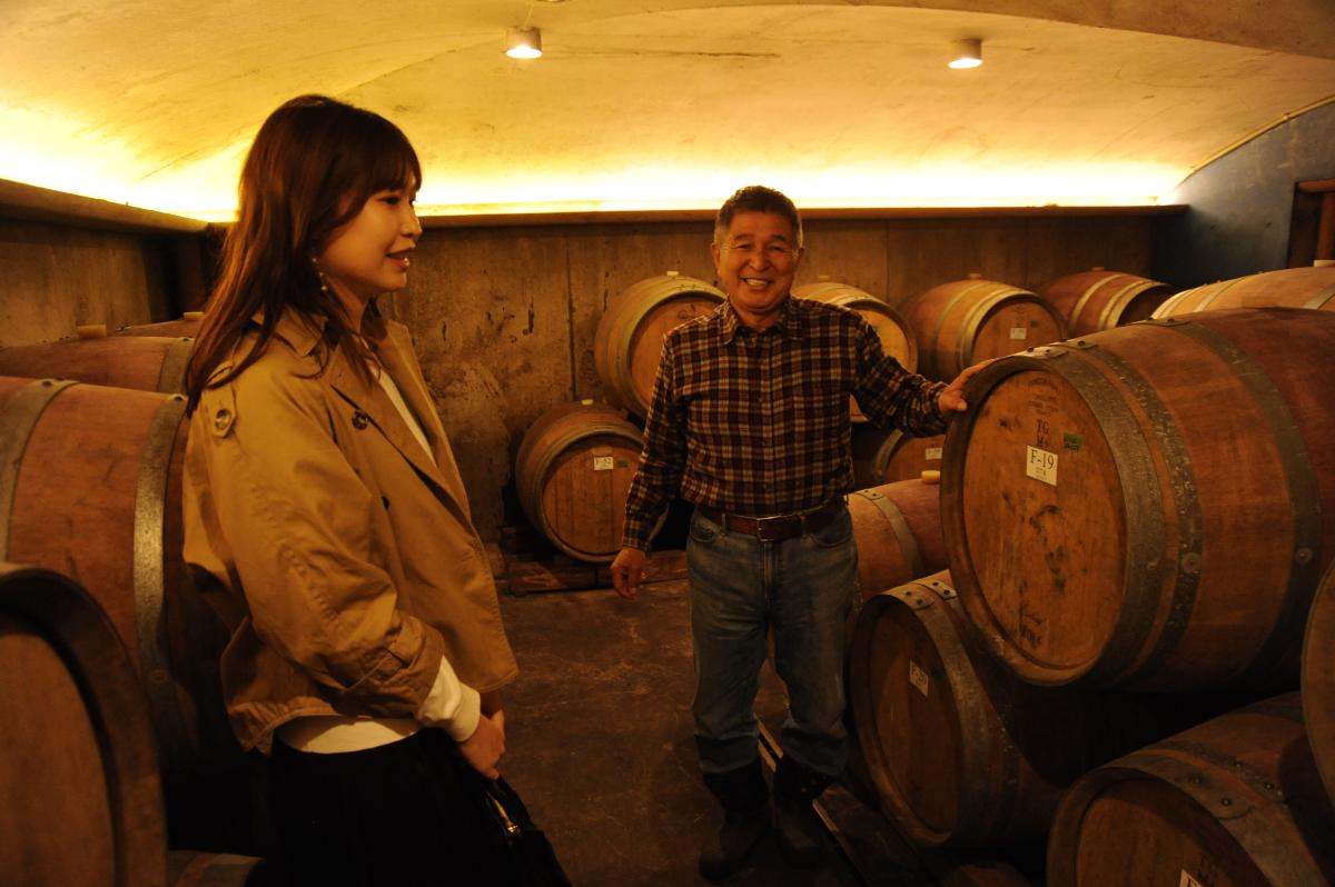 ここを訪れたら、オーナー醸造家である落希一郎さんの解説でワイン造りの現場を見学できるワイナリーツアー「オチガビワイナリー ツアー付き食事プラン」6600円に参加を。一年中温度が変化しない地下に設けられた醸造所や貯蔵庫、ブドウ畑にも足をのばし(雨天時はなし)、ワインが生まれる場所をめぐったあとは、レストランでランチをいただきます。ブドウ畑を眺め、醸造の苦労や工夫を聞いた後に味わうワインの味は格別です。