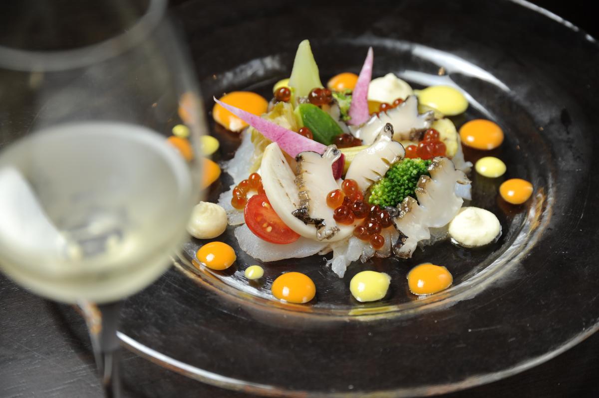 「鮮魚のカルパッチョ」1540円は2種のパプリカのソースと、オリジナルドレッシングを添えて。この日に盛られた魚は、余市沖で釣った真ゾイや数時間前に漁師さんがとってきたばかりの蝦夷アワビ、自家製のイクラ漬けなど。真ゾイは甘みが強くコリコリした食感で“北海道の鯛”と称されるほど味のいい魚です。冬は真ゾイや寒平目、春はサクラマス、夏はムラサキウニやバフンウニ、6~12月はさまざまなイカが皿を彩り、どの季節に訪れても新鮮な北海のめぐみを味わえます。