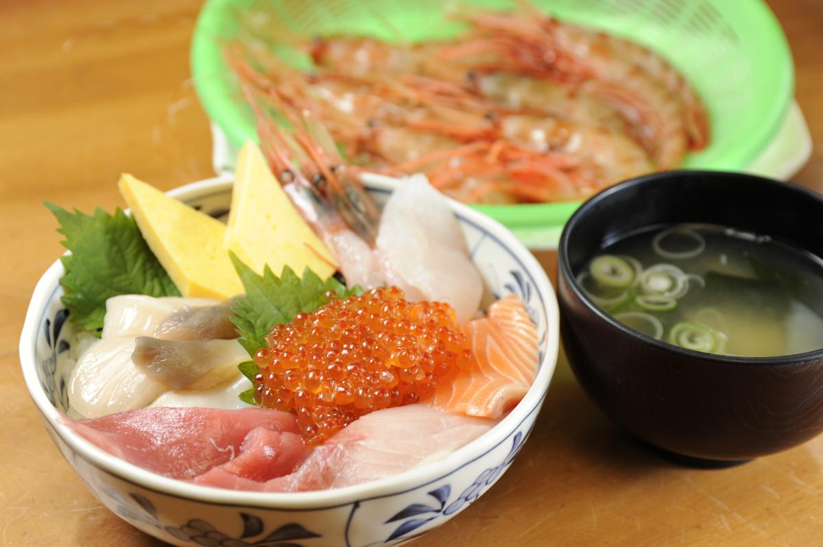 食堂で一番人気のメニューは、帆立貝や甘海老など地物の魚介に、イクラ、マグロ、白身魚などをふんだんに盛った「海鮮丼」1580円(酢飯は+50円。冬期や漁によっては甘海老がツブ貝に変更)です。数量限定で、昼過ぎにはなくなるので早めに食堂を訪れましょう。自分でむいて豪快に頬張る余市産の「活ぼたんえび」時価は、衝撃の甘さとぷりぷり感!産地でしか味わえない鮮度のよさが堪能できますよ。