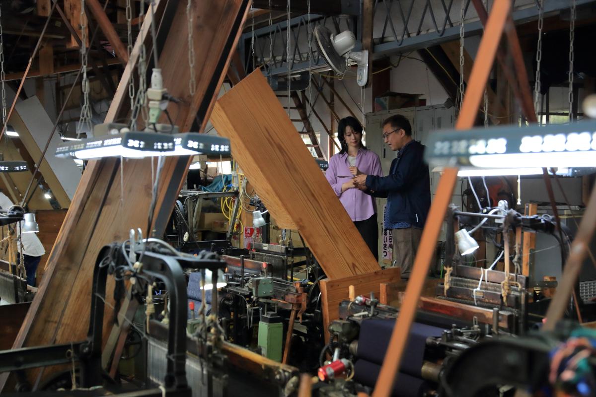 工場の扉を開けると、ミシンの音を何倍にも大きくしたような音が響きます。ズラリと並ぶのは20台ほどの動力織機。糸が途切れないよう、また、織機に不具合がないよう、目を光らせて微調整を加える職人たちが、その間を通り抜けていきます。