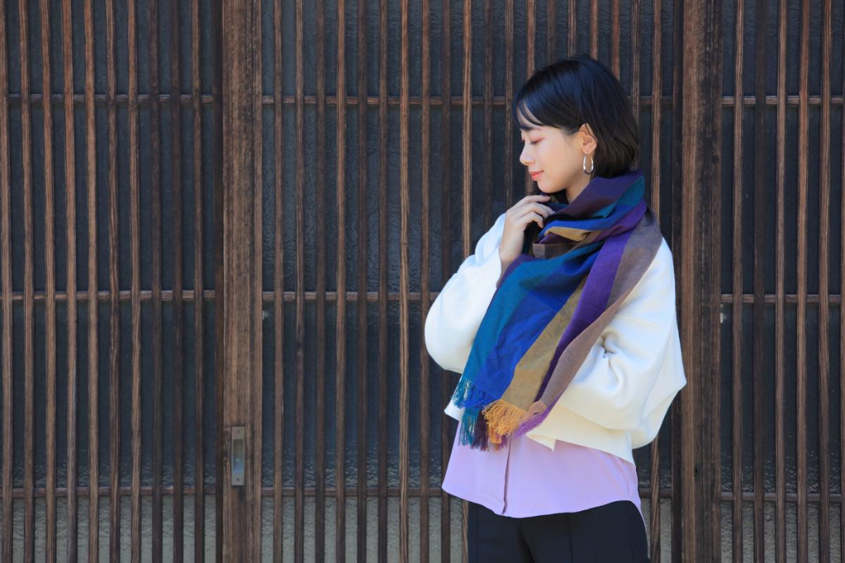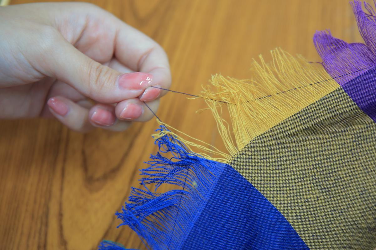 工場見学の後は、好きな柄の生地を選んでストール作りに挑戦。用意されている久留米絣の生地は300種類以上と目移りしてしまうほどです。選んだ生地を適切な長さにカットしてもらったら、耳を適量ハサミで切り、緯糸を丁寧に抜いていきます。この箇所がストールのフリンジになります。フリンジはストレートのままでも、小さな束にして結んでもOK。自分好みのアレンジを加えて世界でただひとつのストールを作り上げましょう。