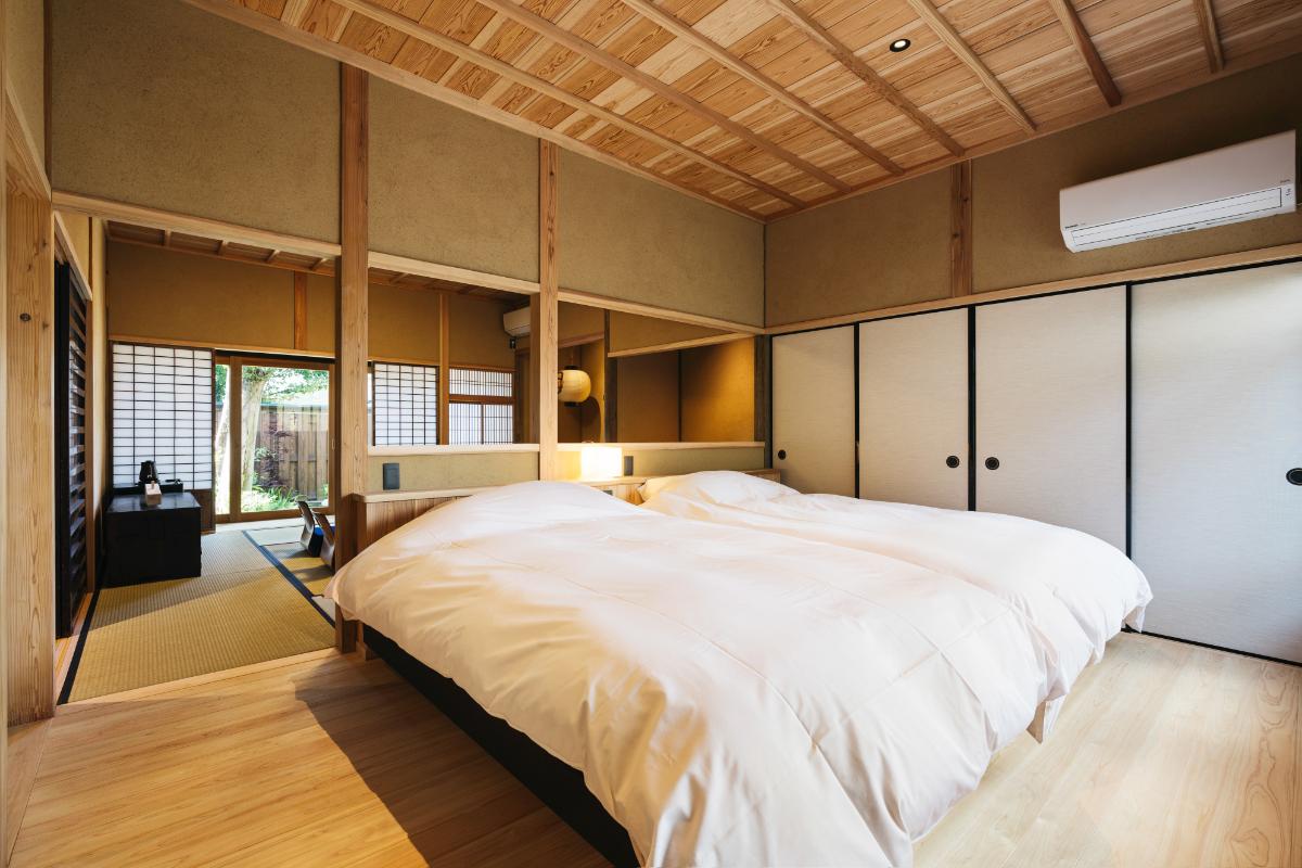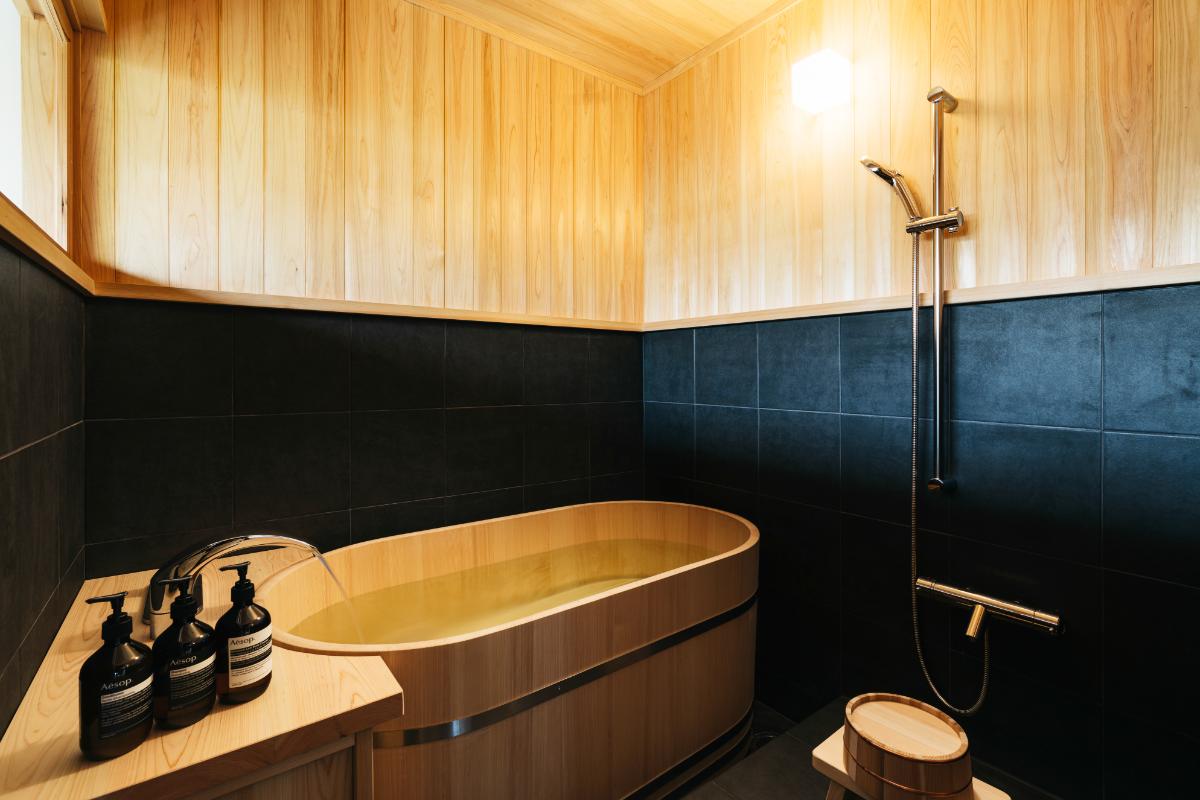 広々とした「九城(くき)」の部屋は土と木の優しい香りが心を穏やかにします。季節によって表情を変える2つの中庭もあり、眺めている時間も贅沢です。さらに、桶職人が作った角の丸い檜風呂もあり、旅の疲れを流してくれます。酒粕や竹炭で作られた洗顔ソープなど、こだわりのアメニティも揃います。