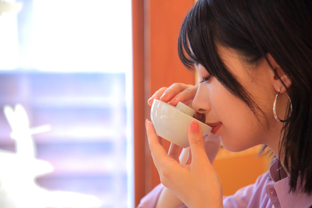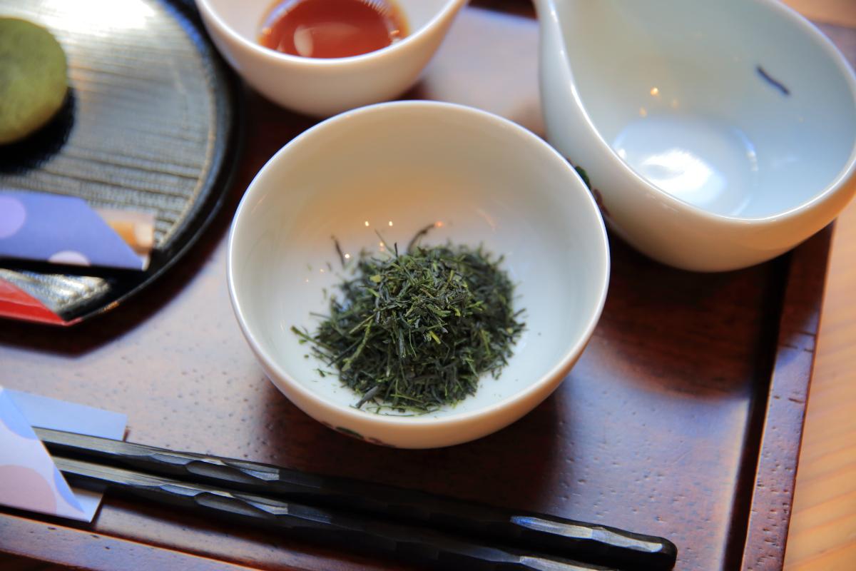 「八女茶カフェ」の「八女茶伝統本玉露」はお菓子付き。お茶は1煎淹れて終わりではなく、3煎ほど味わえます。1煎目はまろやかな甘みを、2煎目は甘さの後にやってくるすっきりとした渋味、3煎目はさっぱりとした味や香りを堪能。湯呑みと蓋の間からすするように飲むと、お茶の味や香りがダイレクトに伝わってきます。また飲み終わった後、残った茶葉をポン酢に付けて食べることも。丁寧に心を込めて栽培された高級茶葉は食べてもおいしいのです。