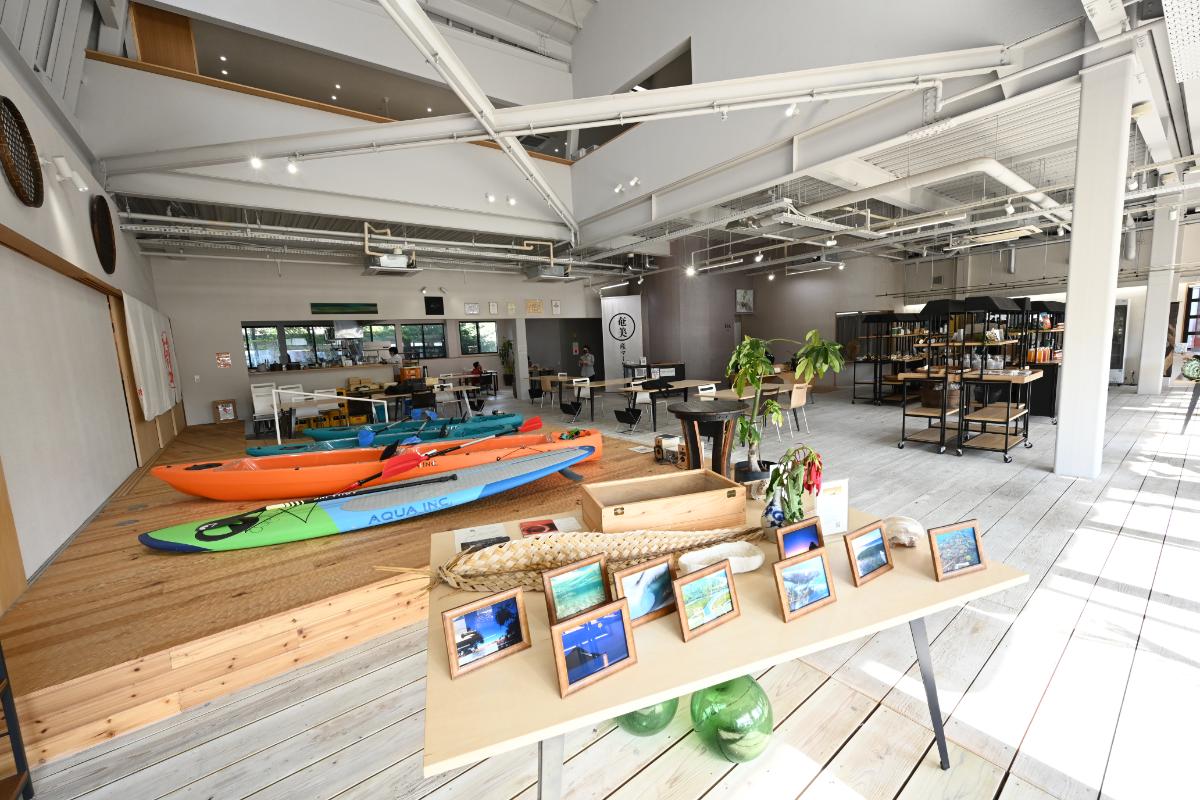地元の人たちに愛されたスーパーマーケットを2018年に改修した「まーぐん広場」。ショップや高齢者施設のある複合施設で、集落の人々も観光客も集う交流の場になっています。“まーぐん”とは “みんな一緒に”という意味の奄美の言葉。放課後にはここのデスクで勉強をする子どもたちも見かけます。「奄美産マーケット」のエリアでは、島の特産品を使ったお菓子やテキスタイルなどがズラリ。また、広場2階にはニューヨークのSOHOを思わせるモダンな客室が人気の「伝泊 赤木名 ホテル」があります。