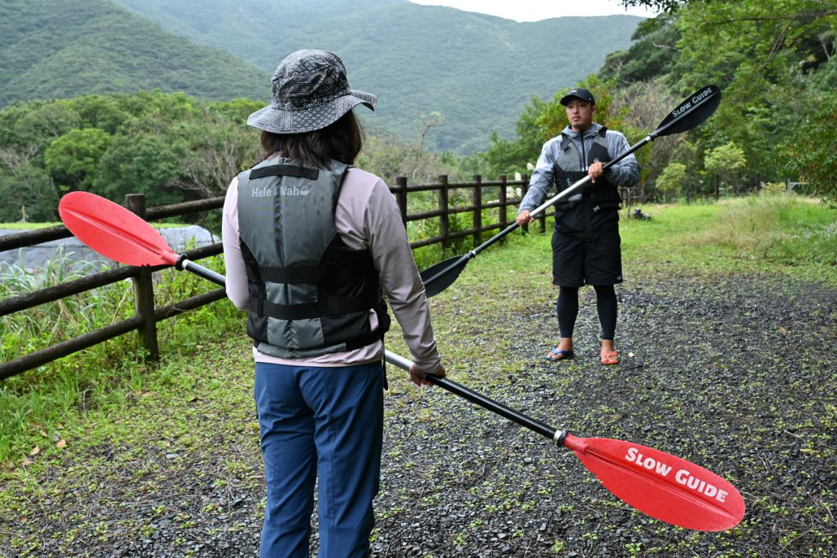 「島人ガイドと巡るマングローブカヌーツアー」では、乗船前にパドルの使い方のレクチャーがあるので初心者でも安心して参加を。