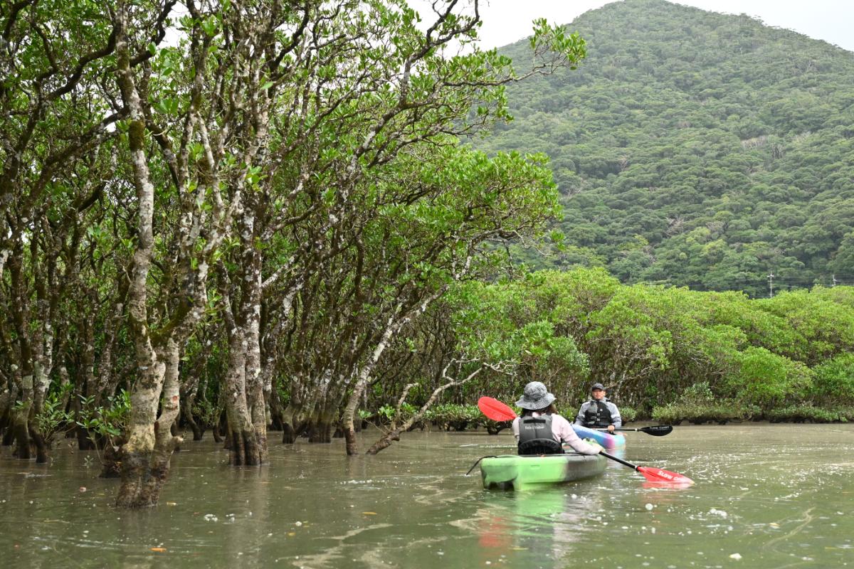 住用エリアには、日本で二番目に広いマングローブの原生林があります。奄美群島国立公園の特別保護区に位置し、手つかずの自然が残っています。木々のトンネルの下をカヌーで通り抜ける体験はここならでは。潮の満ち引きによって景色が変わり、満潮の時間帯ではジャングルの奥へ続く細い水路もコースになります。つい漕ぐことに集中してしまいますが、顔を上げて景色を楽しむことを忘れずに。