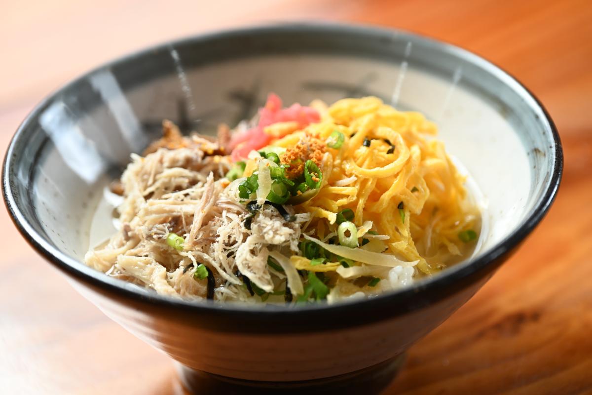 「けいはん ひさ倉」で使われている鶏はすべて直営の農場で地面を自由に運動できるように飼育されています。鶏を丸ごと使った黄金のスープが美しく、食欲をそそられます。米を少な目に茶碗に盛り、具材をのせたらスープをたっぷりと注ぎます。「けいはんは出汁を食べるもの」と店主の久倉さん。味付けも醤油と塩のみとシンプルですが、あっさり、かつコクのあるスープで、おかわりしたくなるおいしさです。