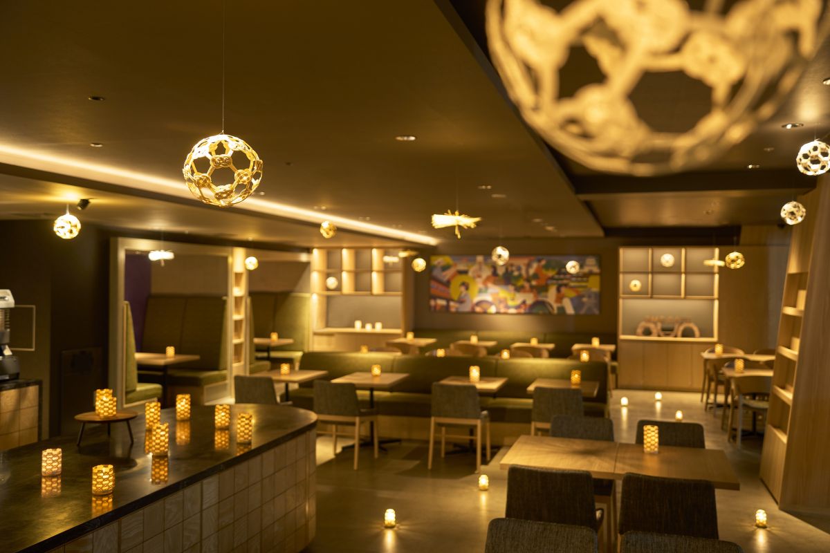 OMO5金沢片町の1階にあるOMOカフェでは、19~23時の夜間限定で、加賀水引に彩られた「水引夜灯りカフェ」をスタート。「加賀⽔引 津⽥⽔引折型」の職⼈がひとつひとつ⼿作業で製作した装飾に灯りがともり、幻想的な空間に変身します。