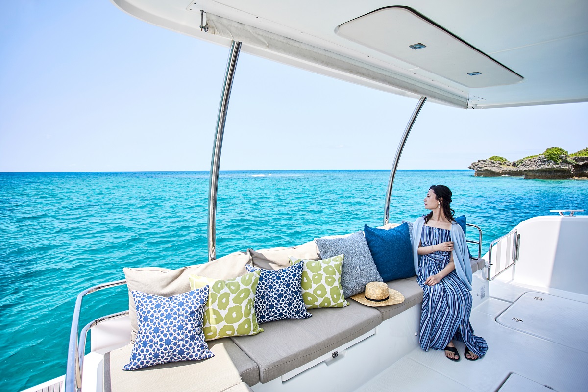 2023年はパワーアップして、「星のや沖縄」仕様に設えた貸切クルーザーでの船旅が楽しめるようになりました。揺れも少ないカタマランクルーザーを利用するので快適。