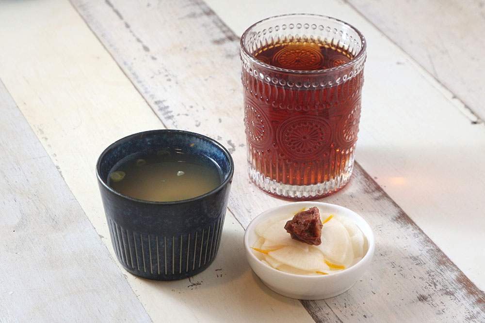 定食には、信州味噌をつかったお味噌汁と、梅で漬けた大根の漬物、そして台湾産の紅茶もついてきます。漬物もお店で漬けているもので、本当に一品一品にこだわりを持ち、時間をかけて作っているのが分かります。