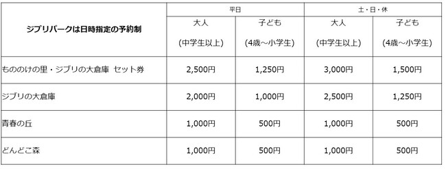 ※ジブリパーク指定の障害者手帳をお持ちの方と、同伴者1名までは各券種の半額料金です。