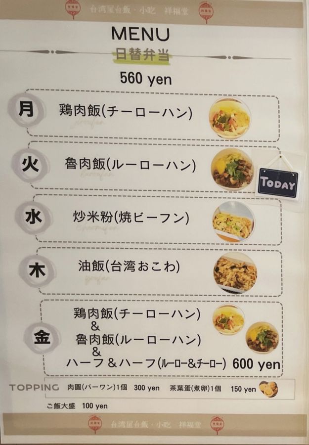 看板メニューは、日替わりで「鶏肉飯(チーローハン)」、「魯肉飯(ルーローハン)」、「炒米粉(焼きビーフン)」、「油飯(台湾おこわ)」を詰めたお弁当。