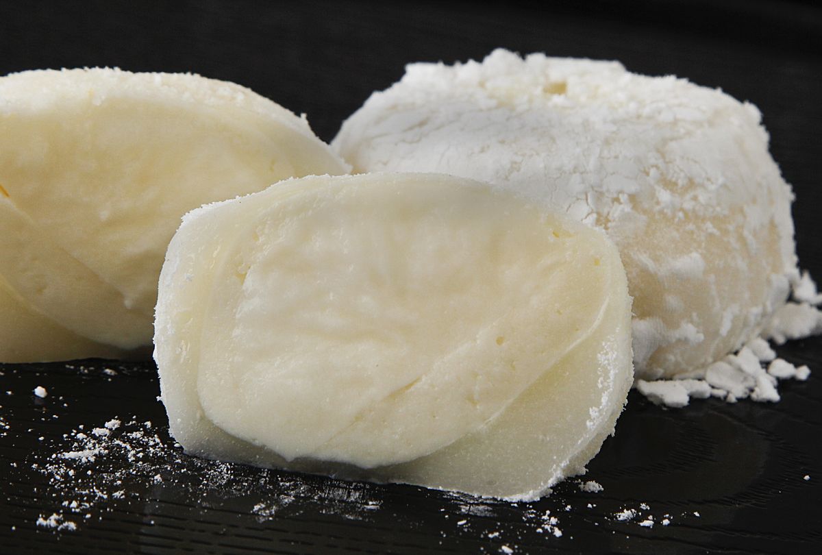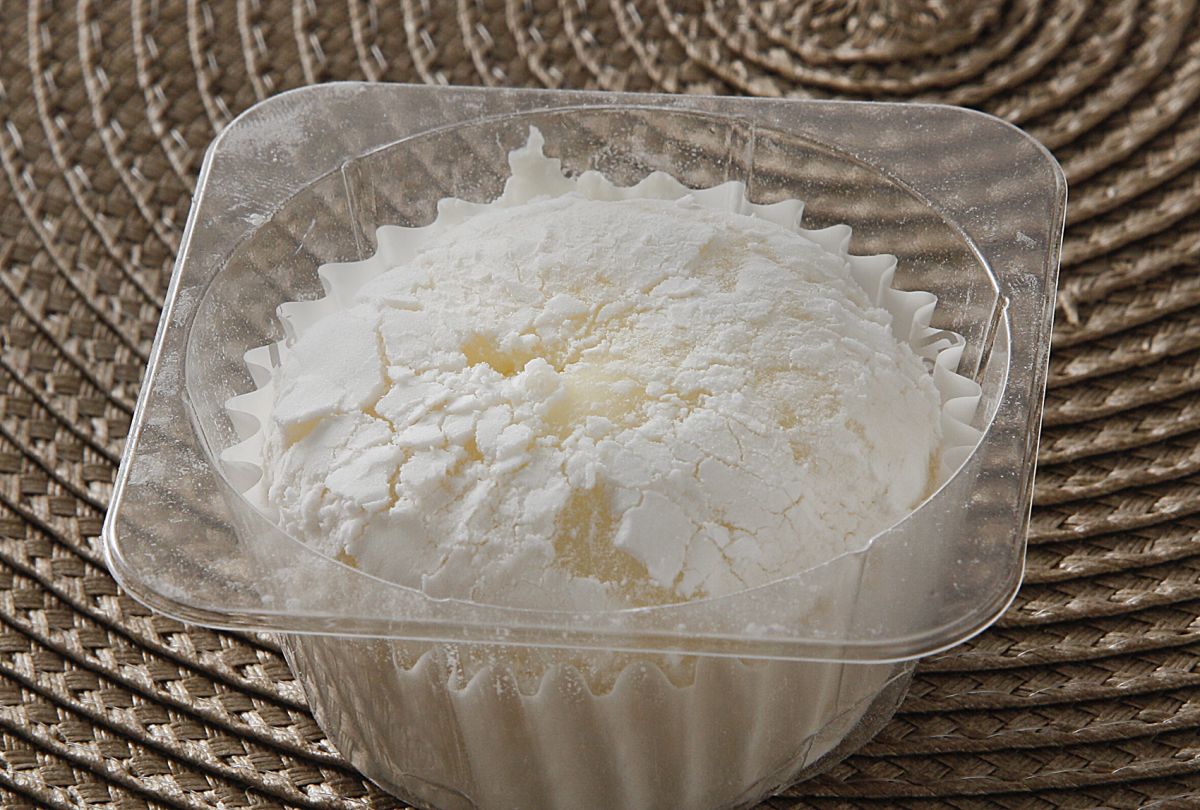 ケースに収まっているのは、白い粉がかかった、まさしく大福。直径は5cmほど、高さは3cmほどです。つんつんと指で押してみると、やわらかくぷよぷよとしていて、プラケースの枠を外すと、とろりと溶けてしまいそう。でも、実際に取り出してみると、それほどには広がらず、ちゃんと自立しています。
