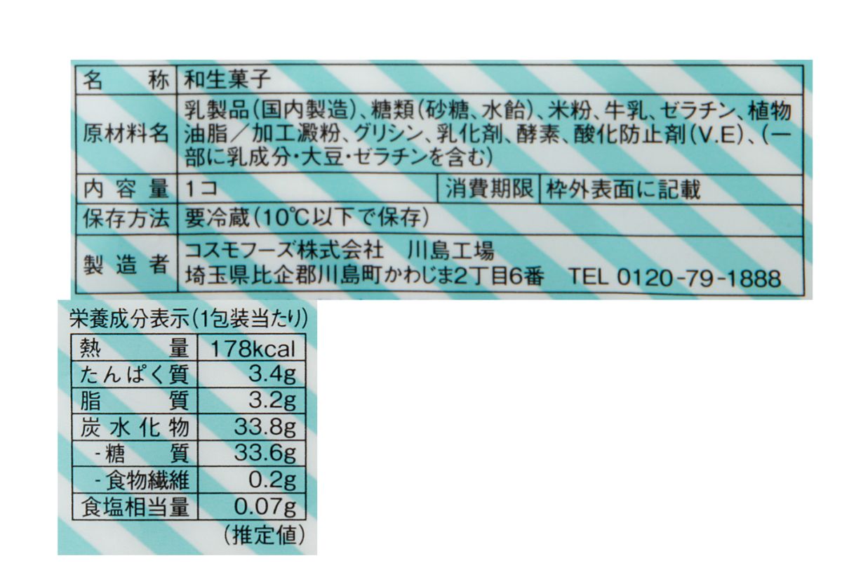 大福なのか、プリンなのか?和菓子なのか、洋菓子よりなのか?ちょっと頭が混乱してしまいますが、公式サイトには「ミルクのコクと味わいを楽しむ大福。」と書かれているので、やはり和菓子寄りなのでしょう。 ブルーの帯を敷いたパッケージには、かわいい牛さんのイラストが描かれています。