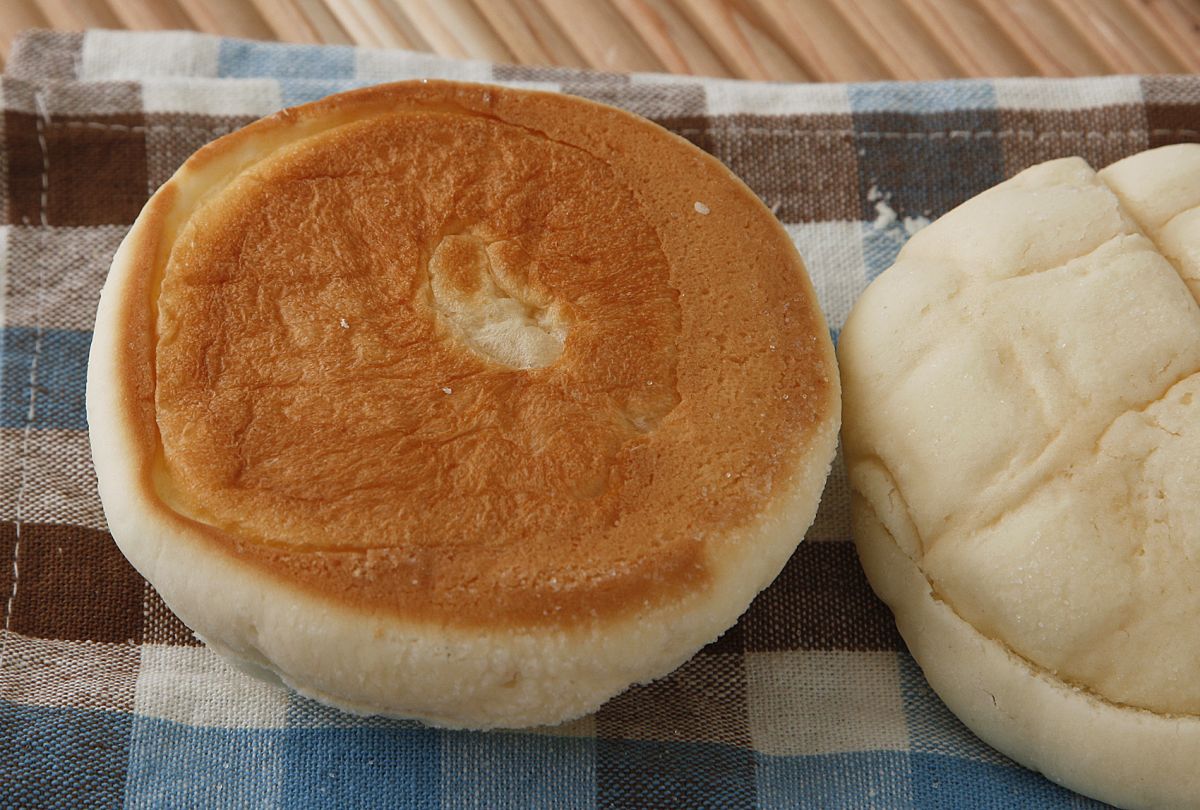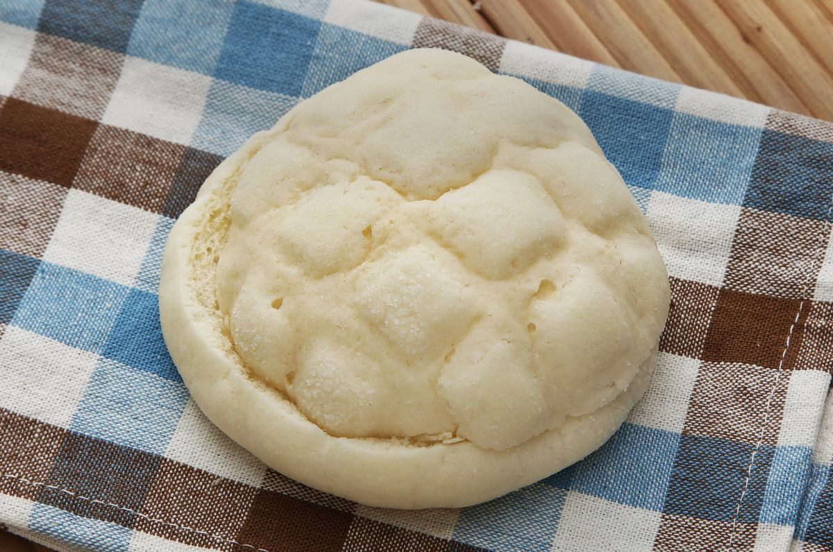 袋から取り出すと、白いメロンパンがお目見え。直径は約10cm。一般的なメロンパンより高さは低く、3.5cmほど。やや平べったいフォルムですね。