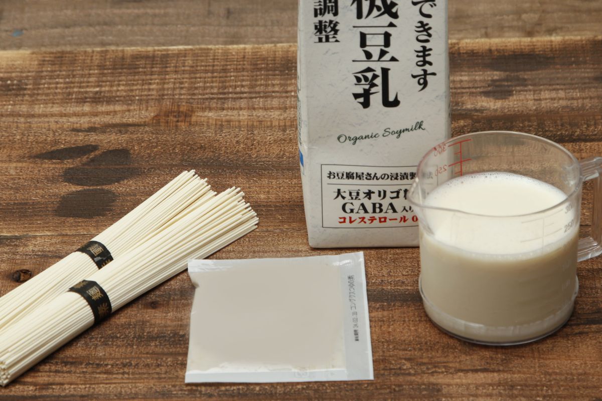 用意するのは、このスープの素に、豆乳とそうめんのみ。豆乳は無調整でも調整豆乳でもOK。冷蔵庫でよ〜く冷やしておきます。