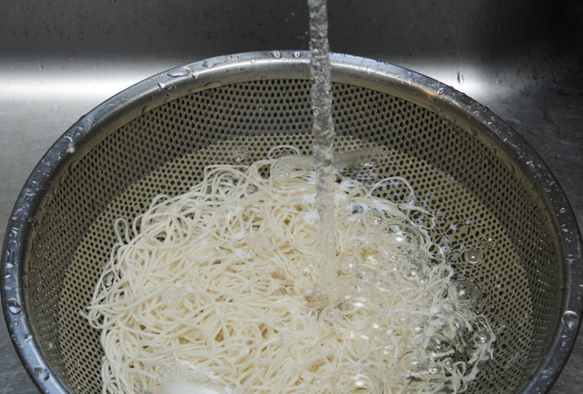 そうめんはゆでて、冷水でよく洗って、引き締めてから、水気を切ります。