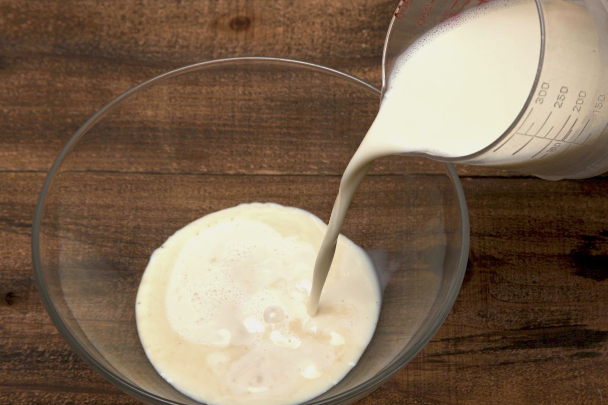 器につゆの素1袋と豆乳200mlを入れ、よく混ぜ合わせます。