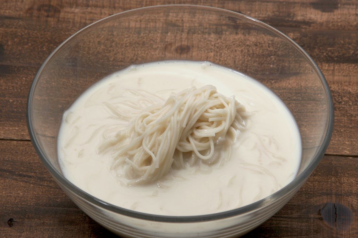 パスタはゆでて、冷水で締めて、水気を切ります。コングスクつゆの素に、そうめんのときよりも少なめの150mlの豆乳を加えて混ぜ合わせ、パスタとあえて、お皿に盛りつけます。
