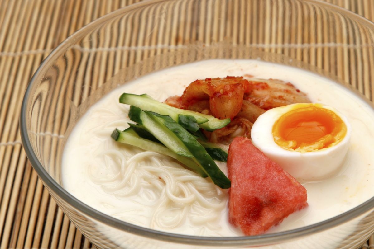 韓国語で“コン”は豆、“グクス”は麺のこと。“コングクス”とは、大豆や黒豆を原料に作ったスープに麺を入れて食べる、韓国の夏の定番料理なのです。