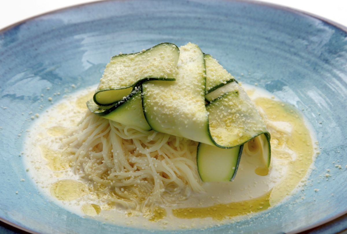 今回はピーラーでスライスしたズッキーニをのせ、オリーブオイル、パルメザンチーズ、コショウをかけて完成。味見をしてみて、薄いようでしたら、塩をプラスすればよいでしょう。