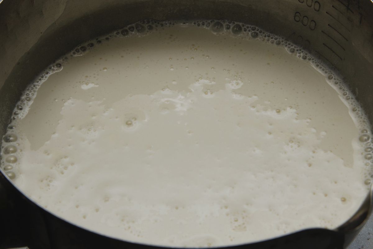 基本の材料は、「シェントウジャン 鹹豆漿の素」1袋と豆乳(無調整)300mlのみ。 まず、豆乳を弱火で沸騰寸前まで温めます。