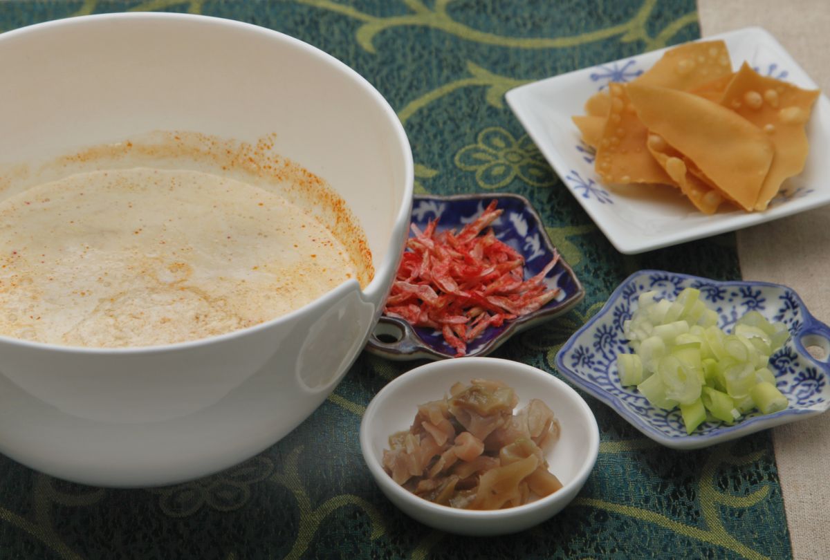 時間に余裕があるときは、好みのトッピングを用意してみましょう。 台湾では油条という揚げパンを添えたりしますが、今回はワンタンの皮を揚げたものを添えて、クリスピーな食感をプラスしました。その他、干しエビ、ザーサイ、ネギなどを揃えて、いかにも台湾な感じを楽しんでみました。