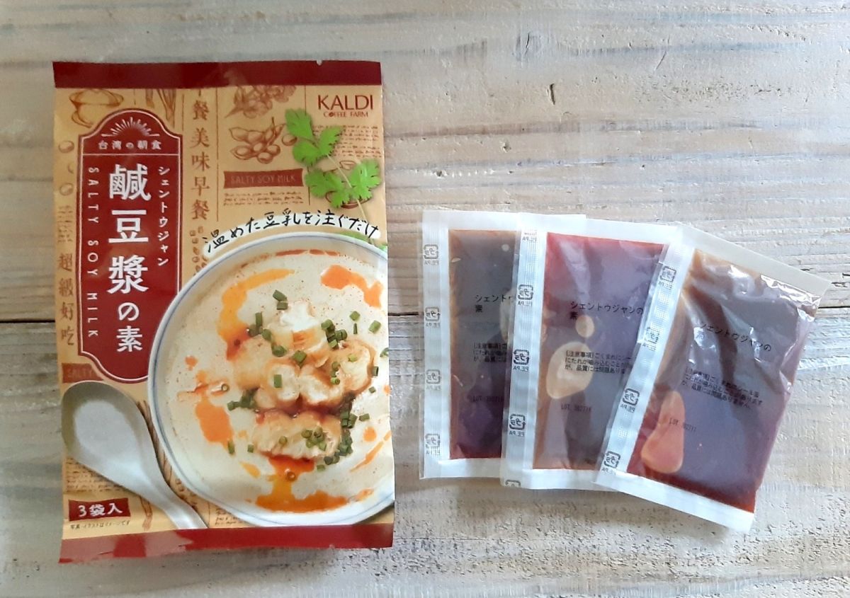 沸騰直前まで温めた豆乳を、黒酢の力で半凝固させた料理で、おぼろ豆腐のような食感とほどよい酸味が魅力の台湾の定番朝食です。そんな料理が自宅で簡単に作れるのがカルディオリジナルの「シェントウジャンの素」(30g×3袋)221円。1つのパッケージに3食分が入っていいます。