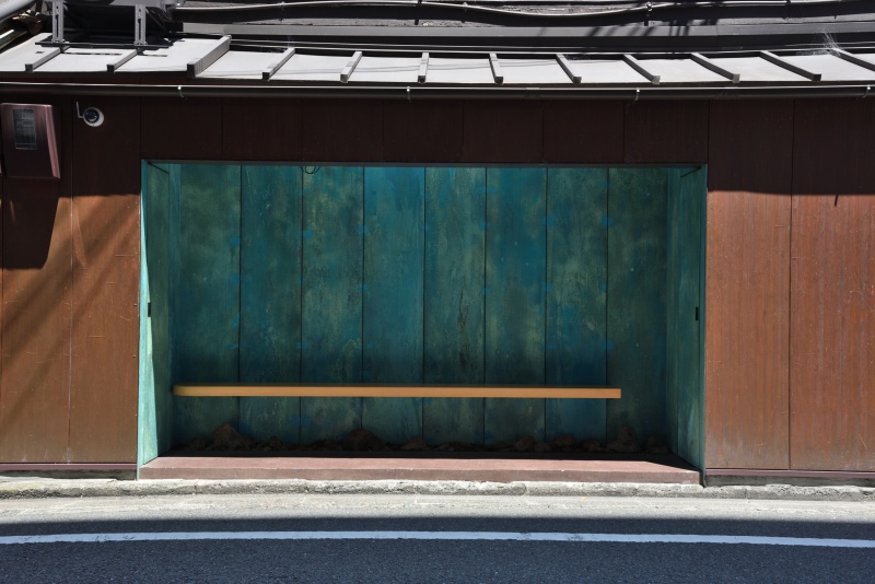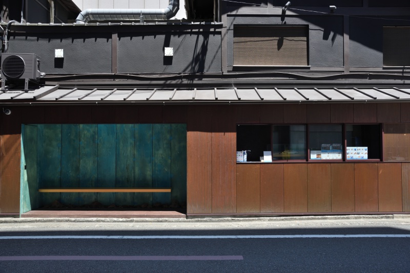 緑がかった青い壁の色は、「末富ブルー」とよばれるブランドカラーを彷彿とさせます。銅素材を科学的に変色させてこの色を出しているそうで、木製のように見える外壁もまた経年変化によってこの色に変わっていくのだそう。よく見るとベンチの下にプチ庭園が設けられ、京都らしさを演出しています。