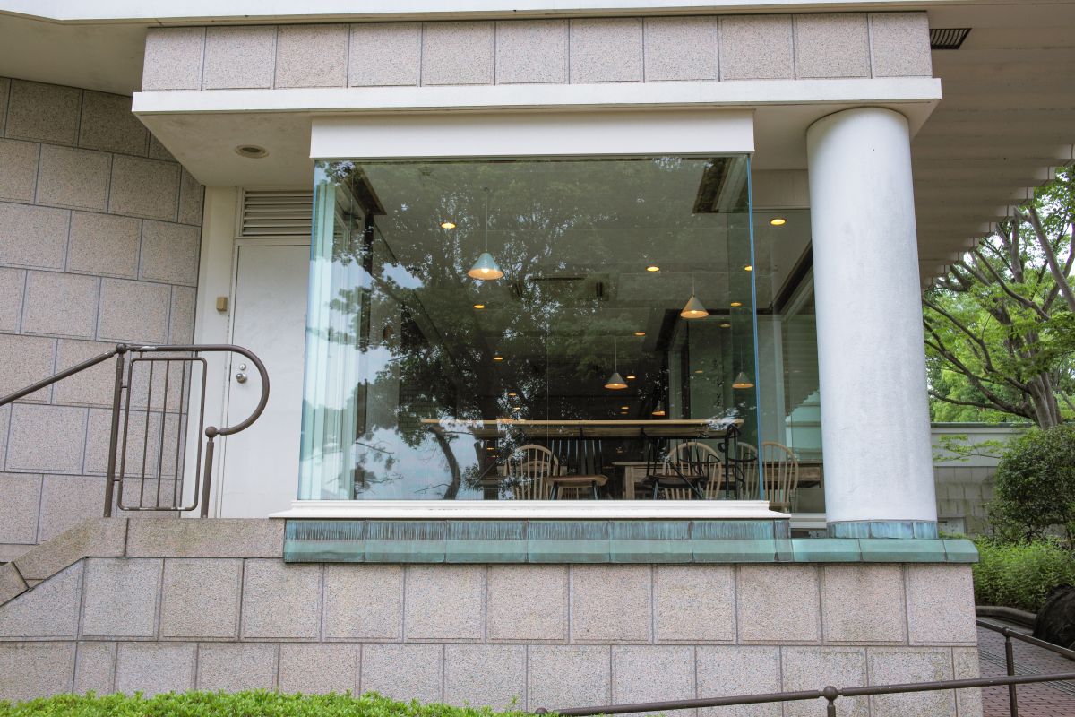 高低差のある建物の1階に突き出ているように見える窓ガラスが「鮨喫茶すすす」の目印。正面入口は写真のスロープを奥に進んでいった神奈川県立神奈川近代文学館のエントランスからアクセスとなりますが、写真左にあるドアからも入れるそう。不思議な造りの外観からどんな空間が広がっているのかとワクワクします。