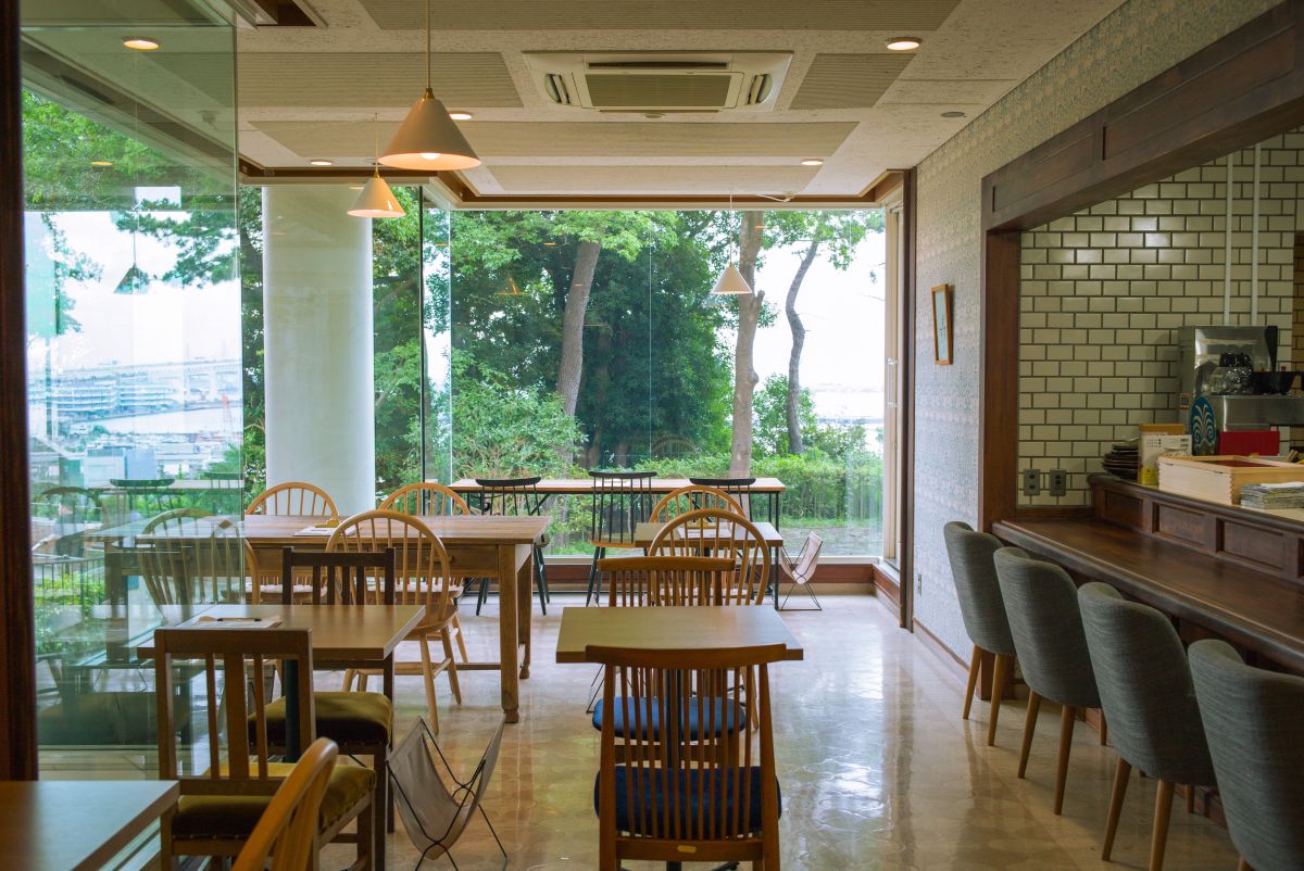 店内はテーブル席とカウンター数席といったこぢんまりとした空間ながら、公園側に面している窓際の席からは横浜ベイブリッジまで望めるという好ロケーション。またにぎやかな路面店とは異なり、文学館の中にあるせいか静謐な雰囲気に包まれていて、落ち着いたカフェタイムを過ごせそうな居心地のいい空間が広がっています。
