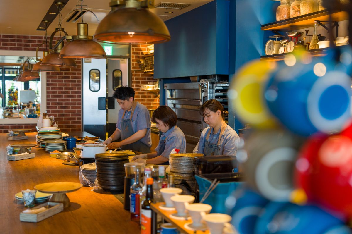 店内は西海岸を感じさせてくれるスロウでリゾート感のある雰囲気。大きなカウンターキッチンでは、パイや料理を作っているところを眺めることができます。