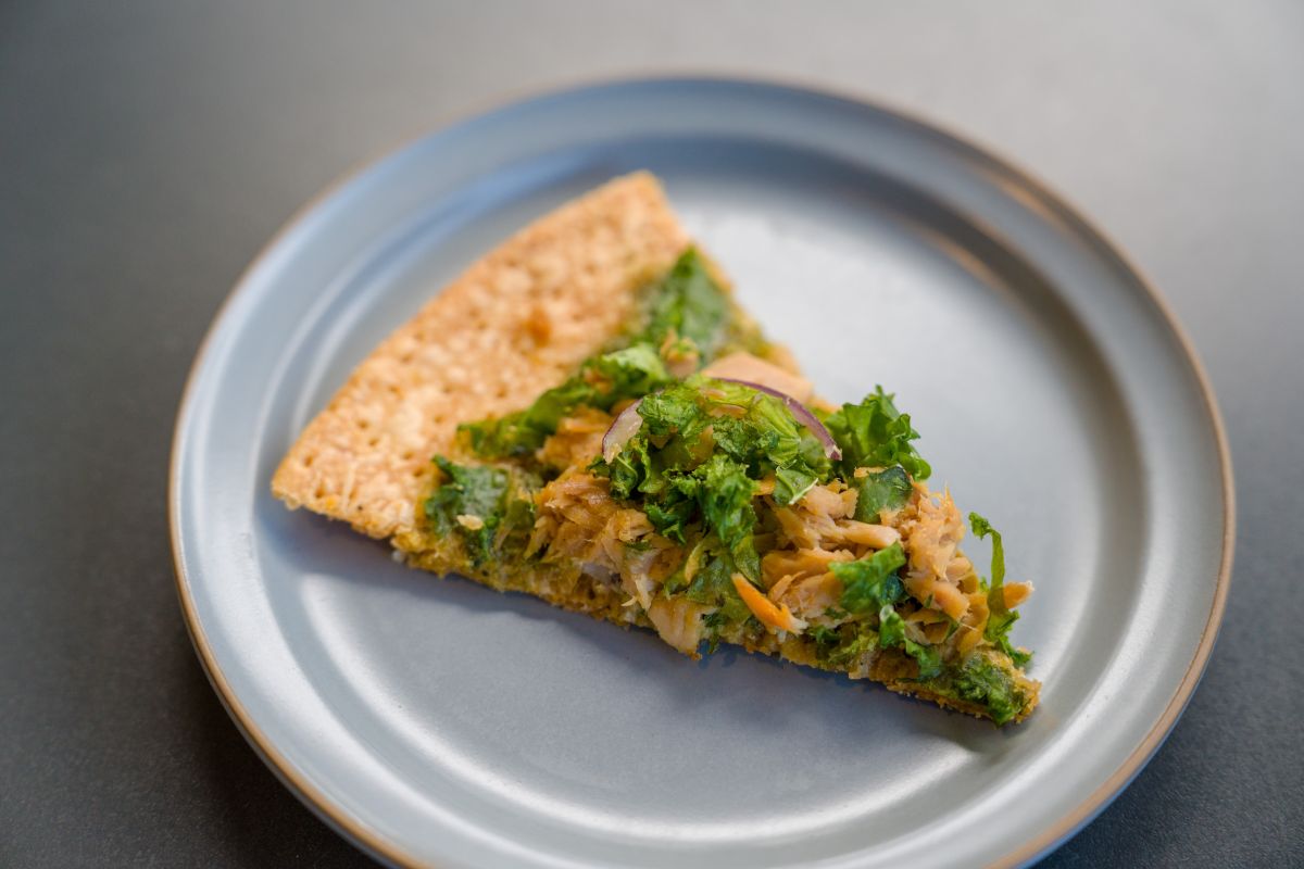 まず席に着くと5種のパイが運ばれてきて、食べ終わると店員さんが追加のパイを持ってきてくれます。そのタイミングで好きなものをオーダーする、という流れ。パイの種類は2カ月に一度内容が変わります。この日の食べ放題パイをご紹介しましょう。 写真は「ツナ・ケールのバジルピザパイ」。パイ生地を平たく成形したピザのような形が特徴的で、バジルが利いた大人のひと品です。