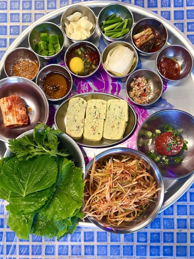 注文をするとまず出てくるのが、お盆に乗せられた「パンチャ」と言われる無料のおかずや、お肉のお供のタレなど。ついつい写真を撮ってしまいたくなるビジュアルで、店舗のレトロ感とマッチしていてよいですね。