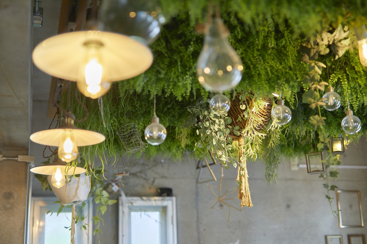店内も外観の期待を裏切らず、おしゃれでシンプルで機能的。メインがフレッシュフルーツのジューススタンドなので席数は少なめ。天井から吊るされたランプと緑が童話の世界のようで、癒されます。