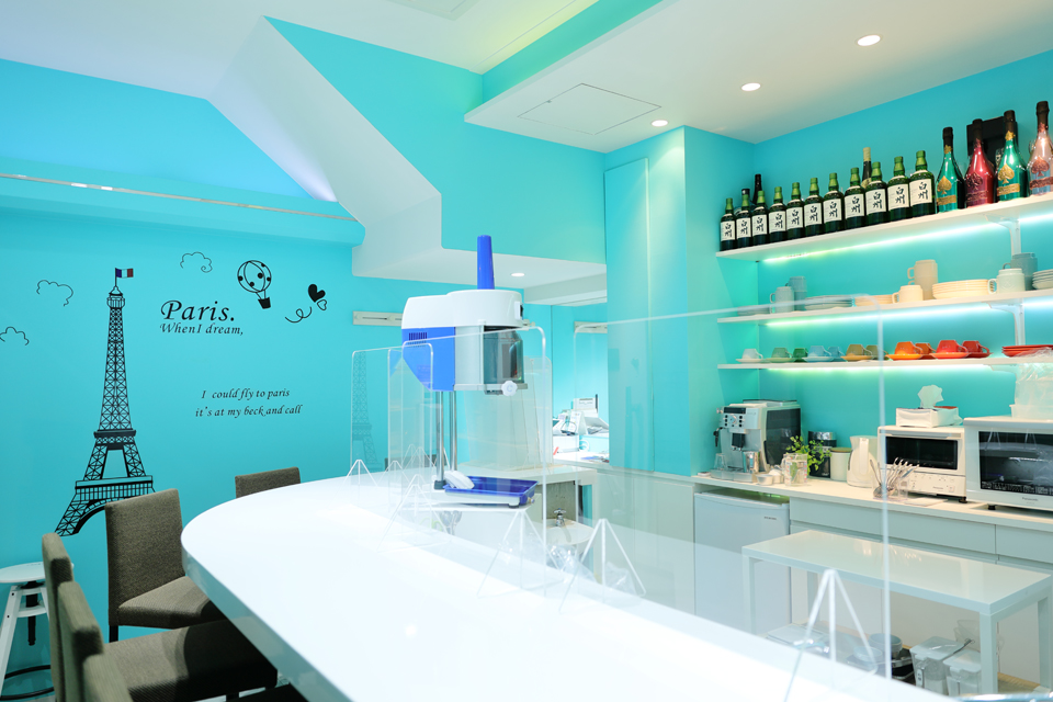 心斎橋駅7番出口から徒歩約2分、にぎわうアメリカ村に立つ複合ビル「BambooAlley(バンブーアレー)」の1階にある「かき氷&デザート&カフェ ボンジョルネ」は、特注の氷、手作りシロップとこだわり尽くしたかき氷が一年中味わえるカフェ。店内は鮮やかなライトブルーが映えるおしゃれな空間で、一気に別世界へ足を踏み入れたよう!