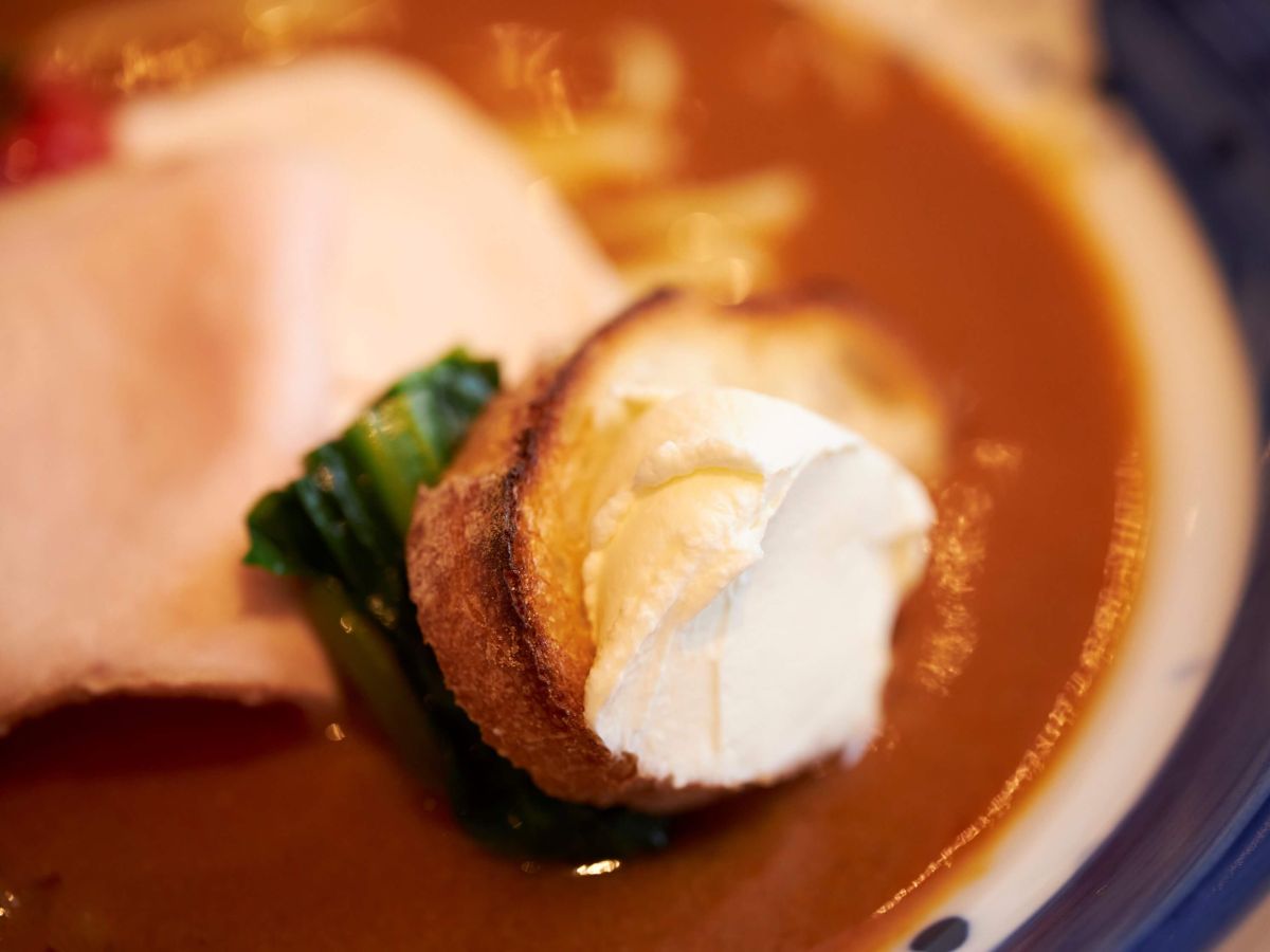 炒めた野菜にたっぷりのブランデーを加え極限まで煮詰めた後、エビの頭・オマールヘッドと水を加えてさらに3時間炊くそう。その後、ハンドミキサーで具材を一気に粉砕し、裏ごしを繰り返して完成するのが、このなめらかなオマール海老100%のスープなんです。