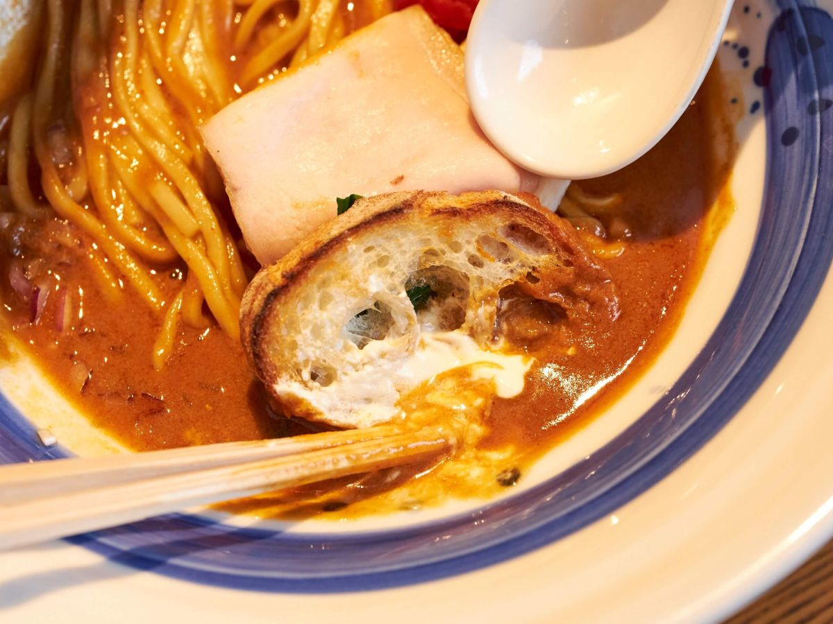 ほかでは味わえないこだわりのトッピングも「元祖海老丸らーめん」の魅力のひとつです。バゲットに添えられているのは、なんとサワークリーム!