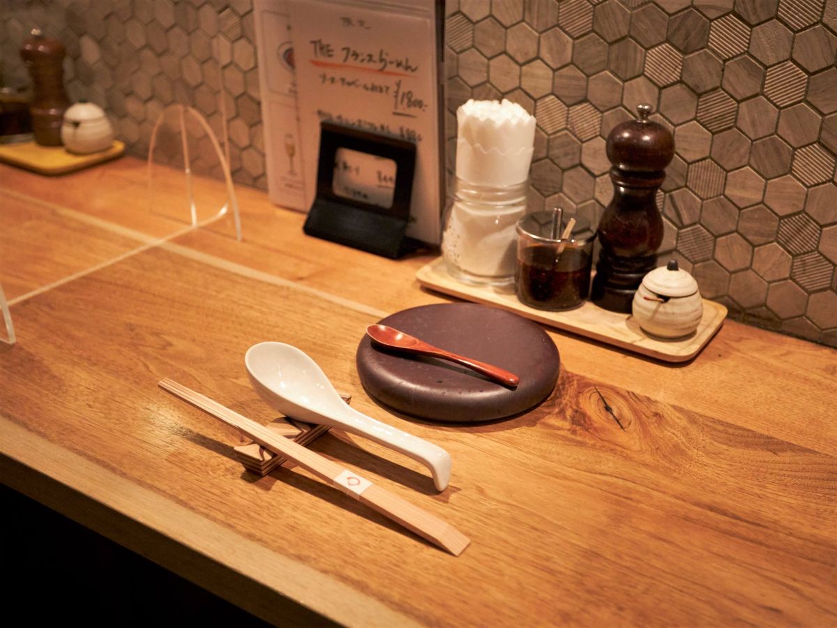 店内はカウンター席とテーブル席の造り。シェフの出身地である岐阜・飛騨高山の木材をふんだんに取り入れた木のぬくもりあふれる空間です。