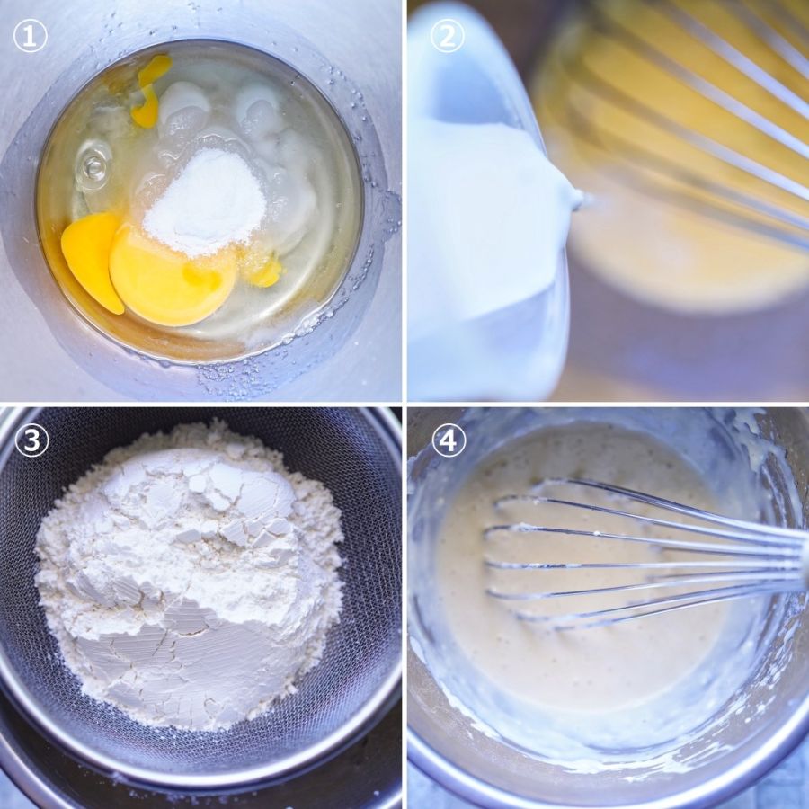 ①ボウルに卵とグラニュー糖、サラダ油と無糖ヨーグルトを入れ、ホイッパーでよく混ぜます。