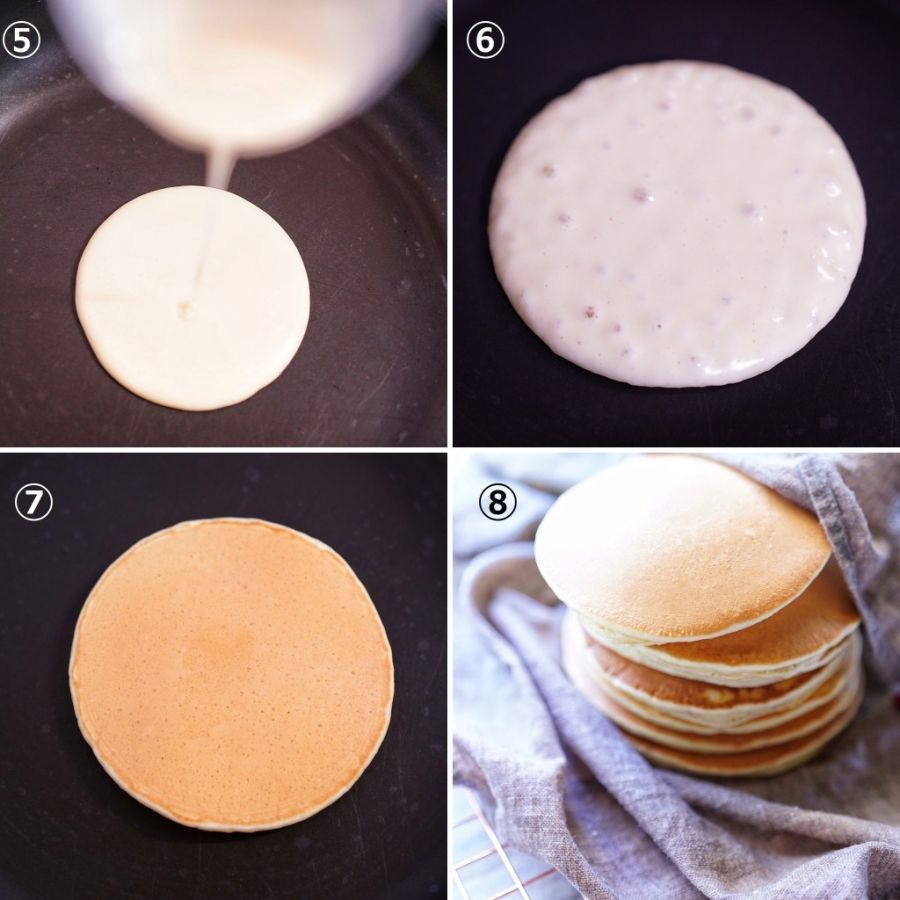 ⑦パンケーキの真ん中が盛り上がり、指で軽く押すと戻ってくるぐらいが焼き上がりのサインです。