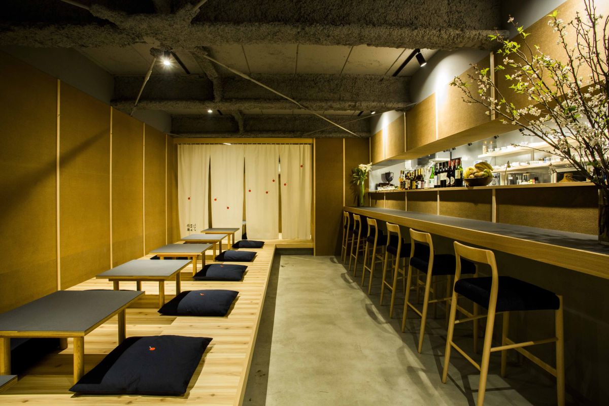 白い暖簾をくぐると、和モダンな空間が!お酒のボトルが並ぶカウンターには、季節の生け花がスタイリッシュに配され、靴を脱いでくつろげる小上がりのテーブル席もあります。