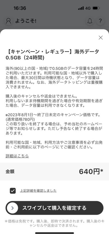 データトッピングの追加は、なんとWi-Fi環境がなくても購入可能。詳細や注意事項を確認してチェックを入れたら、あとは1回のスワイプで簡単に購入できちゃうんです。日々の仕事に追われて海外取材の準備を忘れがちな筆者にとって、うっかり現地に到着してからデータトッピングの購入を忘れていたことに気づいても「povo2.0」に加入さえしておけば安心です。もちろん、事前に国内で購入しておくことにこしたことはありませんが、現地ですぐに購入してネットが使えるようになるというのはどれだけ心強いことか…!