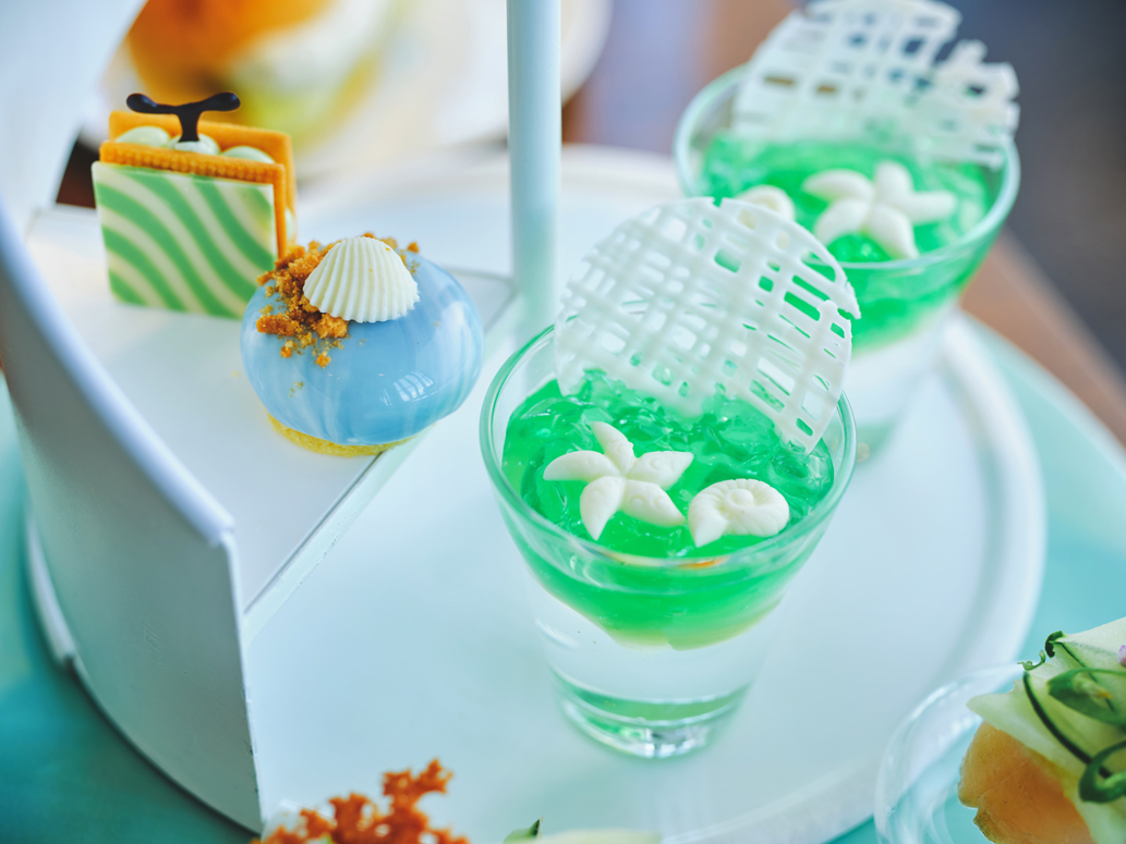 水の中を漂う気泡のようなスパークリングワインのゼリーをベースに、リゾートの海を思わせる「オーシャンメロンゼリー」や青肉と赤肉の2種のメロンを積み上げ、砂のお城を表現した「メロンキャッスル」、メロン模様を思わせるチョコレートをサブレにあしらったアイコニック「メロンスクエア」など、どれも見ているだけでうっとりしてしまうものばかり。それぞれに食感の違ったスイーツが散りばめられいて、食べ進めるのが楽しい!
