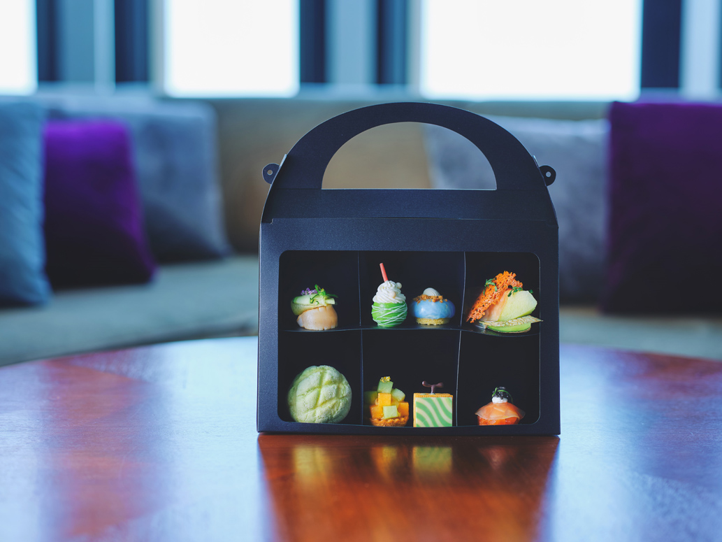 「MELON MANIA」のアフタヌーンティーは、コンラッド大阪オリジナルのファッションバッグのようなボックスに入ったテイクアウトバージョンも楽しめます。自宅で楽しむ自分へのご褒美としてはもちろん、手みやげとしてもおすすめです。