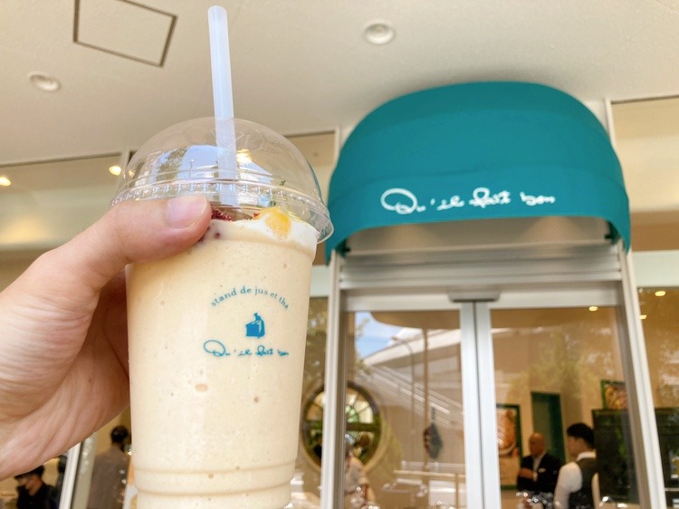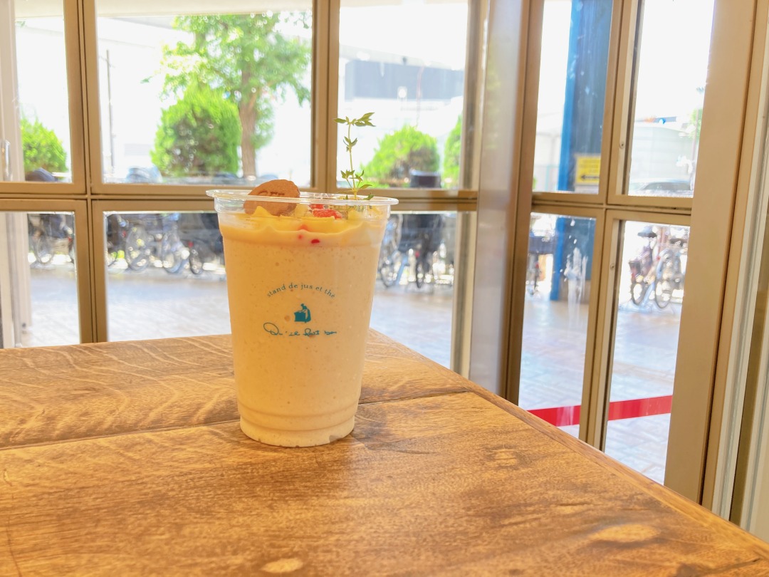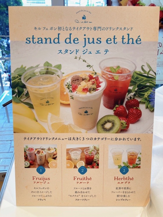 そしてお隣には「stand de jus et thé(スタンド ジュ エ テ)」もオープン。こちらはキルフェボン初の試みとなる、テイクアウト専門のドリンクスタンドです。東京ドームシティはファミリー層や若年層のカップルなど、さまざまな年齢層の方が訪れる場所であり、歩いて周る方も多いことから、より手軽にタルトを味わってもらえるように、という思いを込めてオープンしたそう。とはいえ、想像するのは難しく、タルト専門店のテイクアウトドリンク…?と、思われる方も多いかもしれません。こちらもさっそく飲んでみました。